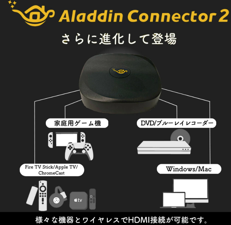 HDMI出力の映像機器をワイヤレスでAladdinシリーズに映すための専用機器です。